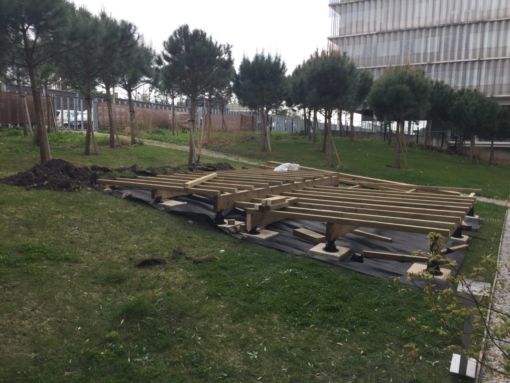La terrasse en pin du nord autoclave est installée dans la pente du jardin de l’hôtel et dispose de différents niveaux. Afin d’éviter la pose de garde-corps, et pour créer une circulation plus fluide invitant à venir profiter de la terrasse et du jardin, des marches ont été réalisées sur les côtés ajoutant un aspect esthétique à l’ensemble.